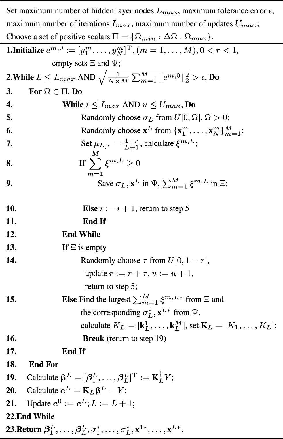 Wang and Li (Wang and Li, 2017a; Wang and Li, 2017b) proposed supervised stochastic configuration networks, and implemented SCNs using three algorithms SC-i (i=I,II,III). SC-i starts with a small network structure (Tin-Yan Kwok and Dit-Yan Yeung, 1997), and uses a supervision mechanism to add hidden layer neurons until the model meets a predetermined error criterion. Since SC-III performs the best of the three algorithms, we next describe the implementation of the SC-III algorithm.