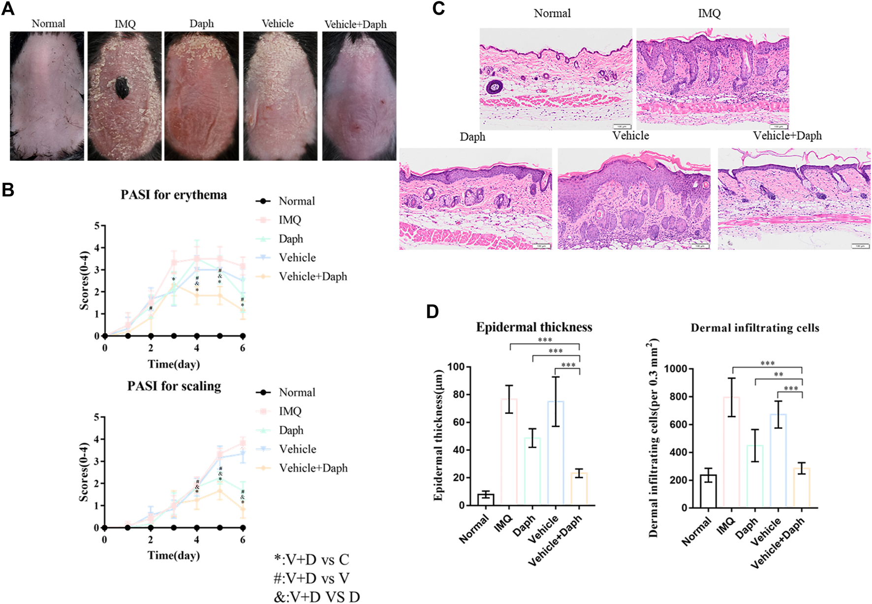 The model of psoriasis-like dermatitis was established in mice with IMQ, and the mice were observed daily and photographed. The modeling of psoriasis-like dermatitis was considered successful according to the photographs. Seven days after the modeling, the mice in the IMQ group showed apparent symptoms of erythema and scales compared with the mice in the control group. Compared with the Daph, vehicle, and IMQ groups, the vehicle + Daph group showed a significant reduction in erythema and the PASI score from day 4 post modeling (Figure 4A,B). The results of HE staining showed that after 7 days of modeling, the symptoms of abnormal epidermal thickening in the vehicle + Daph group were significantly reduced compared with those in other groups (Figure 4C,D).