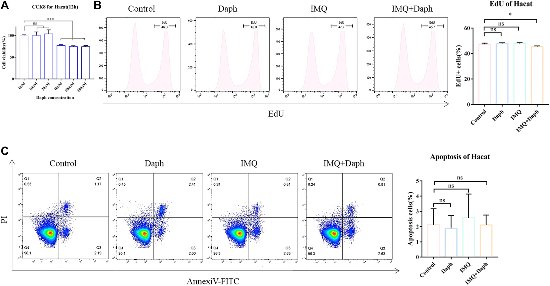 Daph with a gradient concentration was added to the HaCaT cell culture medium. The CCK-8 assay showed that when the concentration of Daph was not more than 20 μM, it exhibited no cytotoxicity to normal HaCaT cells (Figure 7A). Therefore, 20 μM was selected as the Daph concentration in vitro. The inflammatory response of HaCaT cells was induced by IMQ in vitro. Edu results showed that Daph could inhibit the proliferation of HaCaT cells in an inflammatory environment (Figure 7B) but had no significant effect on apoptosis (Figure 7C).