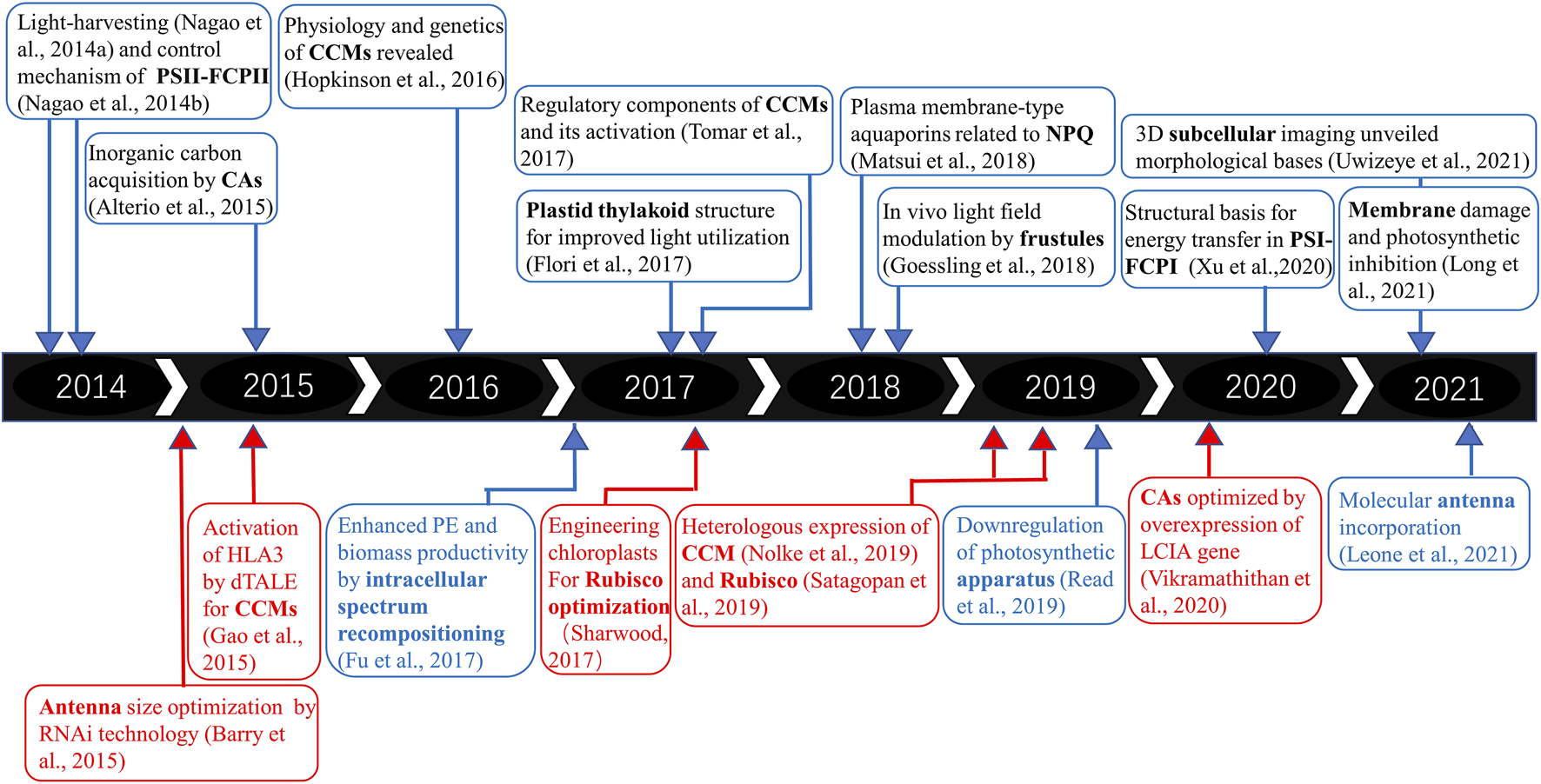FIGURE 1. Timeline and basic and applied research trends on microalgal PE and biomass productivity. The upper panel refers to fundamental research on PE in diatoms, and the lower panel refers to practical applications of synthetic biology tools. The red part represents green microalgae, while the blue region represents diatoms.