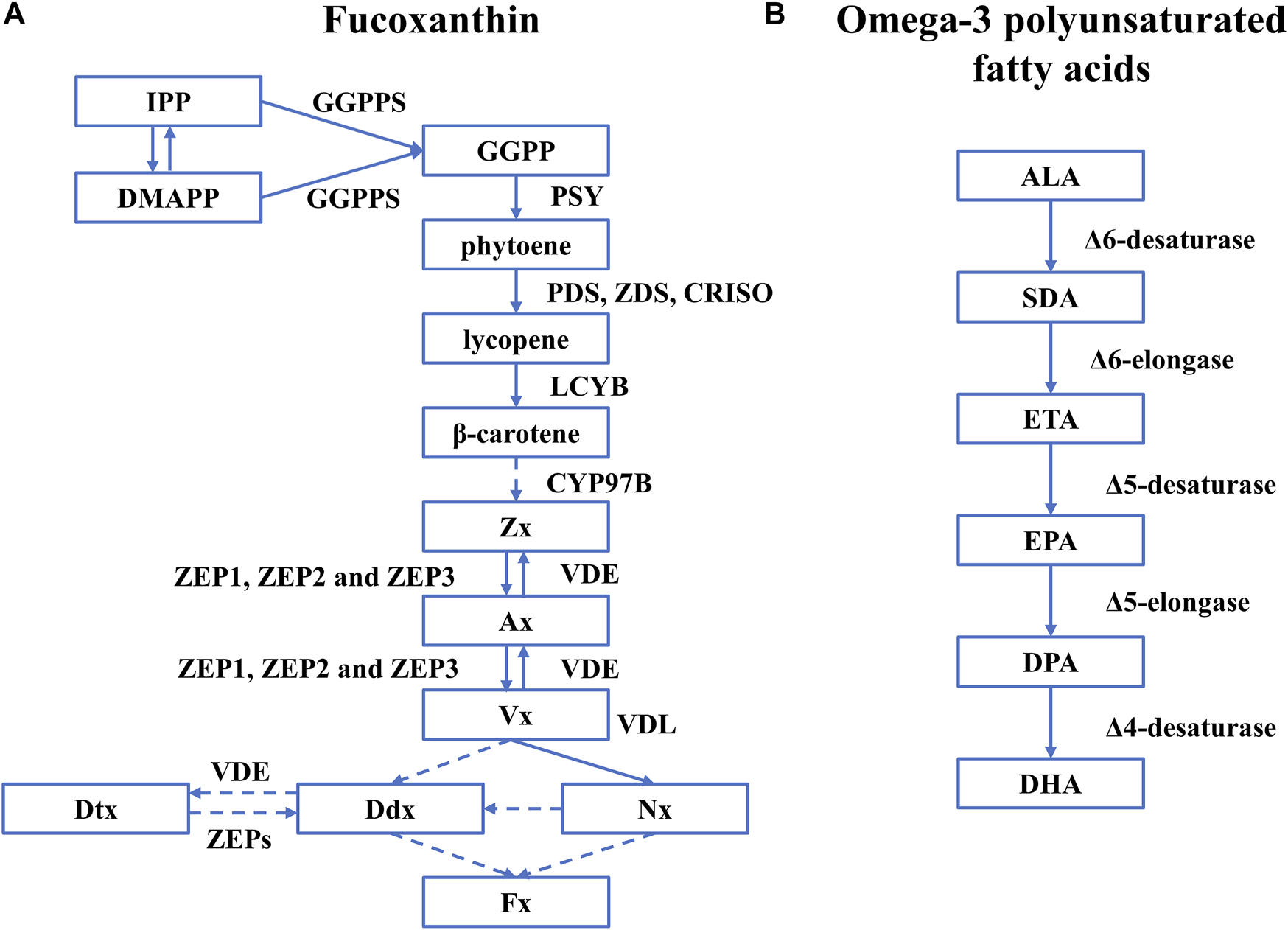 FIGURE 2. The biosynthetic pathway of Fx and omega-3 polyunsaturated fatty acids in diatoms. Rectangles represent intermediates, and arrows represent biosynthetic pathways and active enzymes. (A) Fucoxanthin. The figure was adapted from a previous publication (Manfellotto et al., 2020). A dashed line represents the unknown biosynthetic process. (B) omega-3 polyunsaturated fatty acids. The figure was adapted from a previous publication (Sayanova et al., 2017) and only covers the pathway of omega-3 polyunsaturated fatty acids. Abbreviations: IPP, isopentenyl pyrophosphate; DMAPP, dimethylallyl diphosphate; PSY, phytoene synthase; GGPPS, geranylgeranyl pyrophosphate synthase; GGPP, geranylgeranyl diphosphate; PDS, phytoene desaturase; ZDS, ζ-carotene desaturase; CRISO, carotenoid isomerase; LCYB, lycopene β-cyclase; Zx, zeaxanthin; ZEP1, ZEP2, and ZEP3, three types of Zea epoxidase; VDE, violaxanthin de-epoxidase; Vx, violaxanthin; VDL, violaxanthin de-epoxidase-like proteins; Nx, neoxanthin; Ddx, diadinoxanthin; Dtx, diatoxanthin.