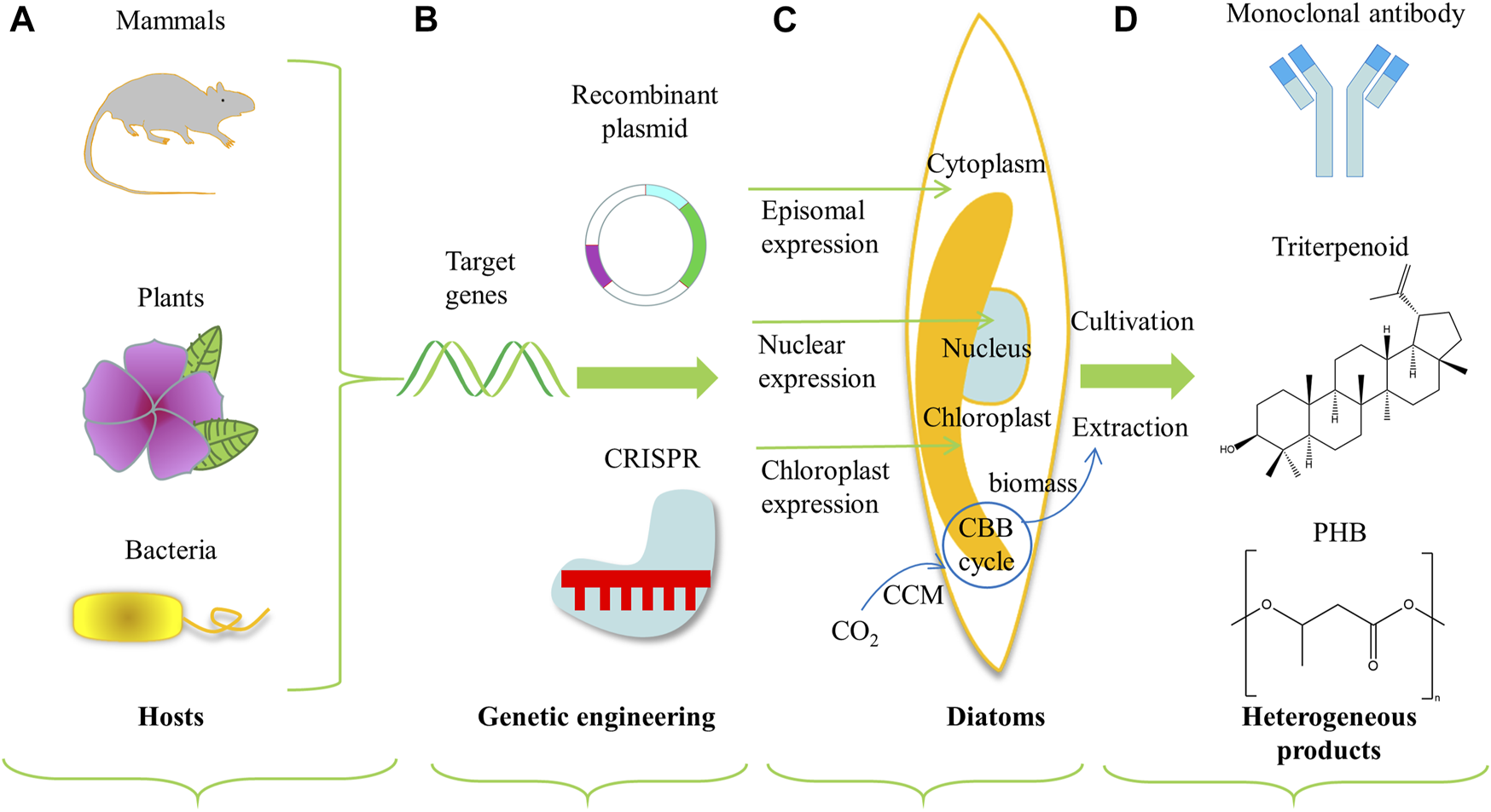 FIGURE 3. Schematic diagram of engineering diatoms as cell factories for heterologous production of value-added compounds. Heterologous expression system includes (A) the selection of target source genes, (B) conventional genetic engineering or genome engineering technologies like CRISPR, (C) DNA transformation and expression locus in diatoms, and (D) production of value-added compounds (D'Adamo et al., 2019). The part with blue cycle and arrows represents the framework for inorganic carbon utilization. Abbreviations: CBB, Calvin–Benson–Bassham cycle; CCM, carbon concentrating mechanism; PHB, Poly-β-hydroxybutyrate.