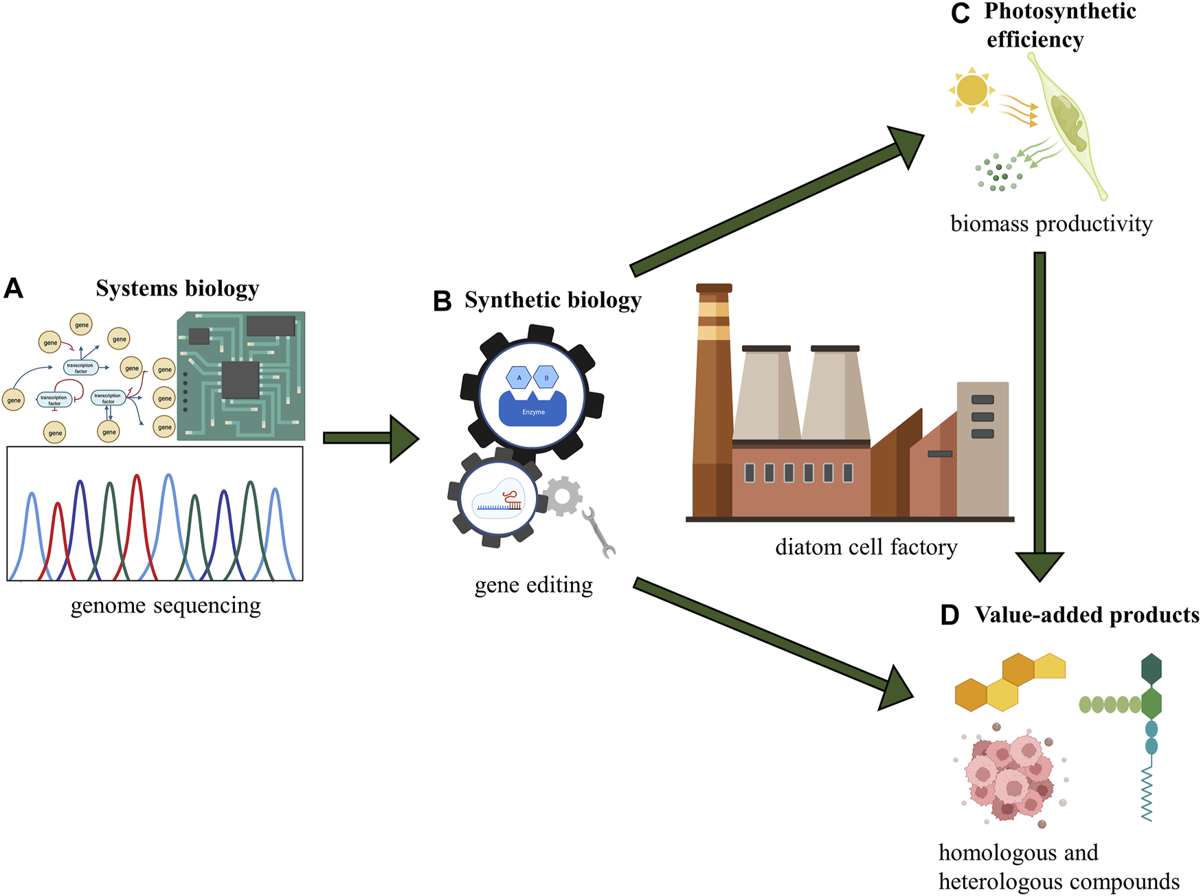 Although the knowledge of the biosynthetic steps of bioactive compounds and genetic engineering help improve the yield and productivity of value-added compounds, diatom synthetic biology is still in its infancy. The essential enzymes and genes of interest, together with their regulation, are not fully understood. The diversity of the genome also poses a significant challenge to developing efficient, convenient, and stable transgenic tools for practical application since there has been no report of using the popular CRISPR technology for heterologous expression in diatoms yet. However, with the continuous development of gene-editing technology, new tools such as TALENs and CRISPR/Cas9 play a critical role in producing value-added compounds in diatoms. The combination of synthetic and systems biology will also allow us to understand better the compound conversion pathways and energy flows in diatom cell factories. These new technologies will facilitate the discovery of new compounds and the improvement of their yield, making diatoms one of the best candidates for cell factories. In the foreseeable future, we can anticipate that more compounds for bioenergy, food, feed, and pharmaceutical industries will be developed through algal cell factories, which could play an essential role in the green economy.