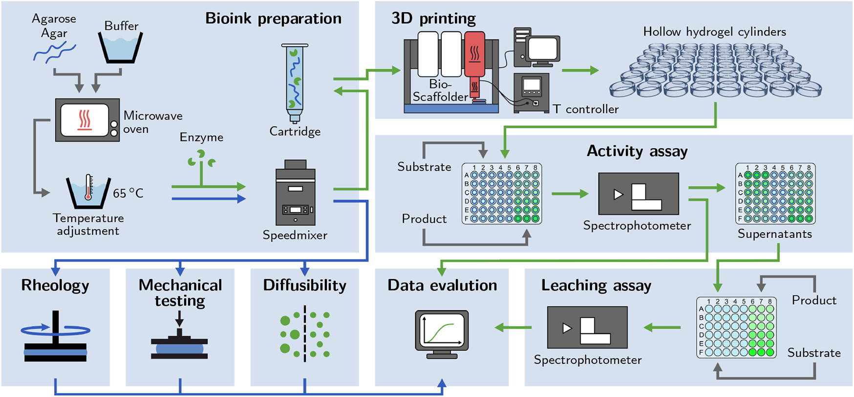 Schematic of the applied workflow. Bioinks based on different concentrations of low-melt agarose and agar are prepared. Enzyme-loaded hydrogel cylinders are printed to perform activity assays. The supernatants are used for leaching assays. Enzyme-free bioinks and hydrogels are examined with rheological analysis, mechanical testing and diffusibility measurements.