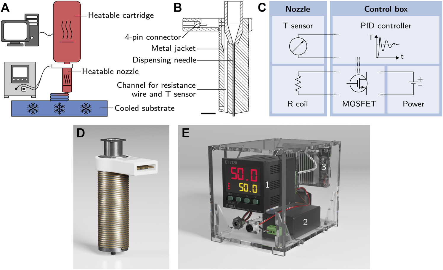 (A) Scheme of the printing setup with a heatable cartridge, a customized heatable nozzle and a cooled substrate. (B) Cross-section of the metal jacket of the heatable nozzle before the assembly of resistance wire and temperature sensor (the scale bar represents 5 mm). (C) Simplified circuit layout of the setup showing the interaction of the nozzle containing a temperature sensor and a resistance coil with the control box containing a PID controller, a power supply and a MOSFET control board. (D) 3D illustration of the heatable nozzle used for the printing process. The assembled nozzle consists of a 3D-printed steel body containing a commercially available 2 inch steel dispensing tip with an inner diameter of 0.35 mm and a Pt 100 element as a temperature sensor. A resistance wire is coiled around the body of the nozzle for heating. (E) Control box containing a PID controller 1), a 12 V power supply 2) and a MOSFET control board 3) to regulate the temperature of the heatable nozzle.