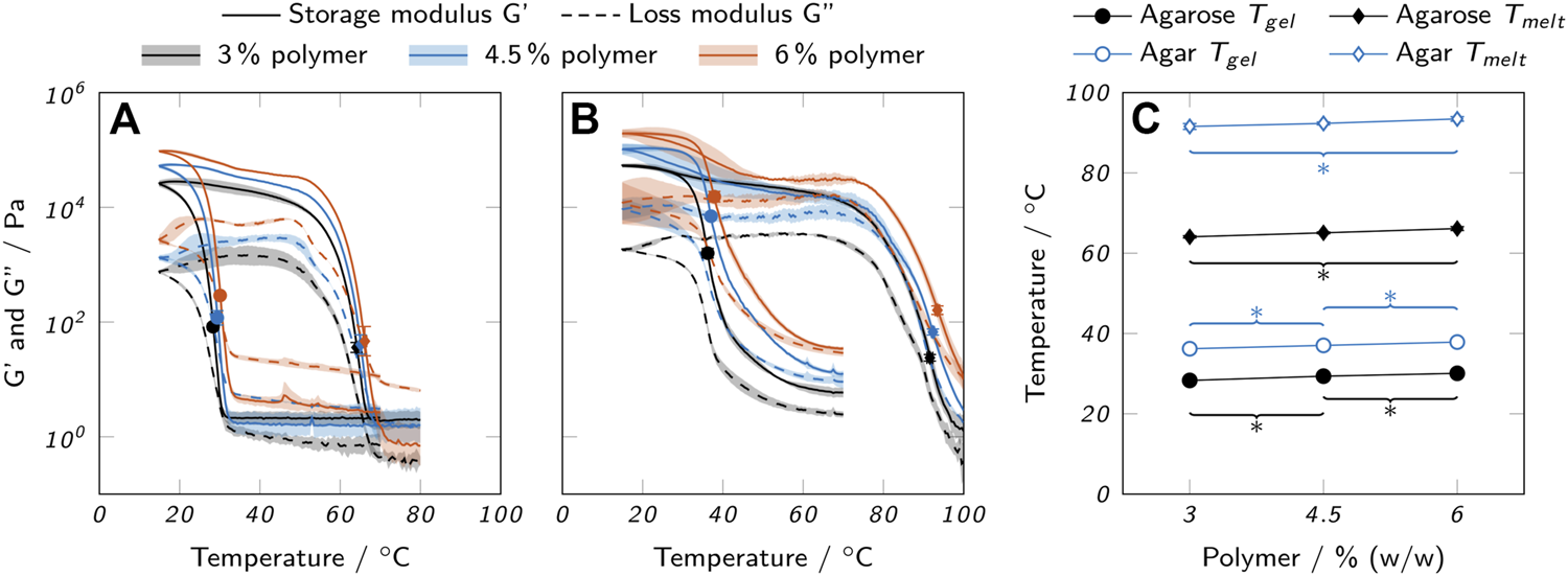 Thermal properties of low-melt agarose and agar hydrogels. Loss and storage modulus of (A) low-melt agarose and (B) agar hydrogels are shown over temperature. (C) Melting and gelling points of low-melt agarose and agar, as derived from the oscillatory measurements. All data are shown as mean values with the standard deviation as shaded areas or error bars (n = 3). For clarity, only significant differences to the nearest significantly different data points are highlighted by asterisks (p < 0.05).