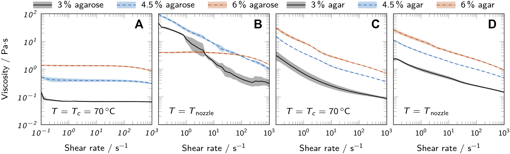 Viscosity curves of all prepared bioinks at 70°C and the respective nozzle temperature Tnozzle used for printing. Low-melt agarose bioinks at (A) 70°C and (B)Tnozzle are compared to agar bioinks at (C) 70°C and (D)Tnozzle. All curves show mean values and the standard deviation as shaded areas (n = 3).