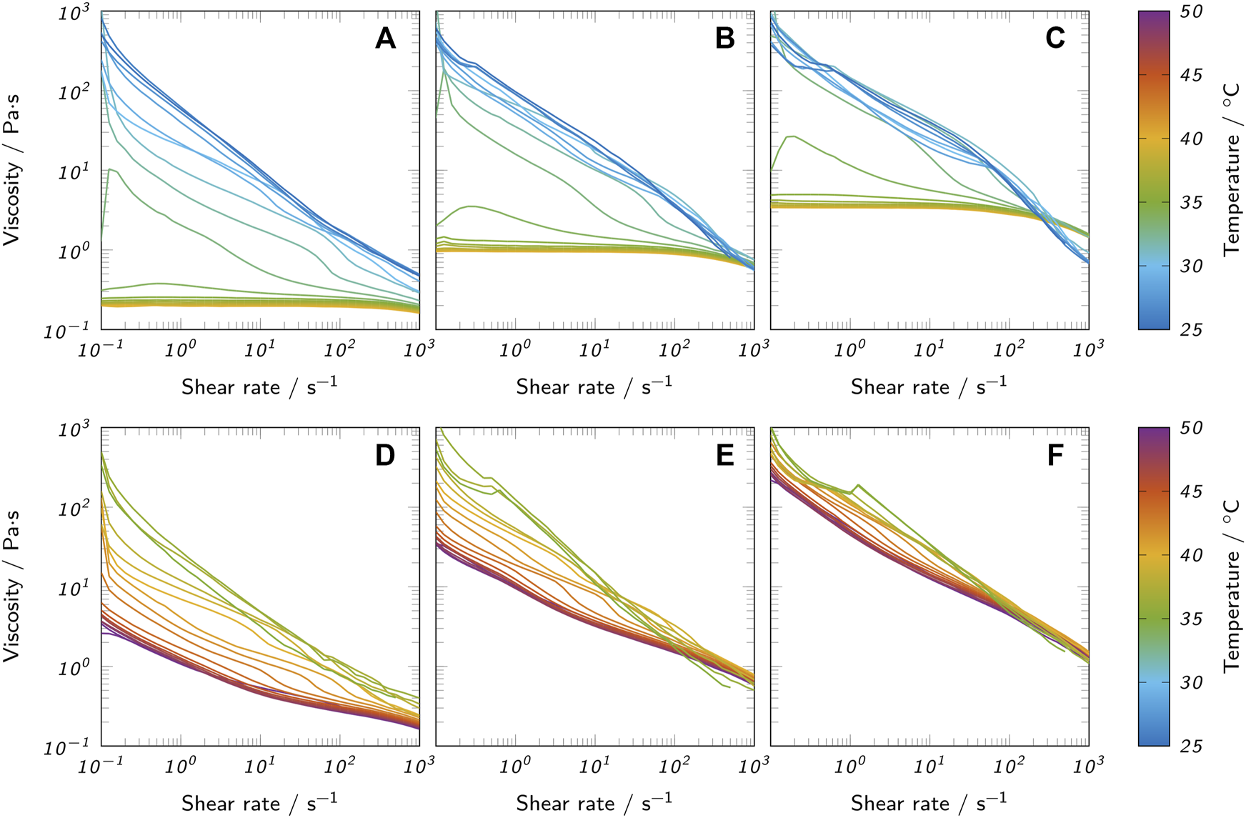 Flow curves of all prepared bioinks at different temperatures. (A) 3% low-melt agarose, (B) 4.5% low-melt agarose, (C) 6% low-melt agarose, (D) 3% agar, (E) 4.5% agar and (F) 6% agar.