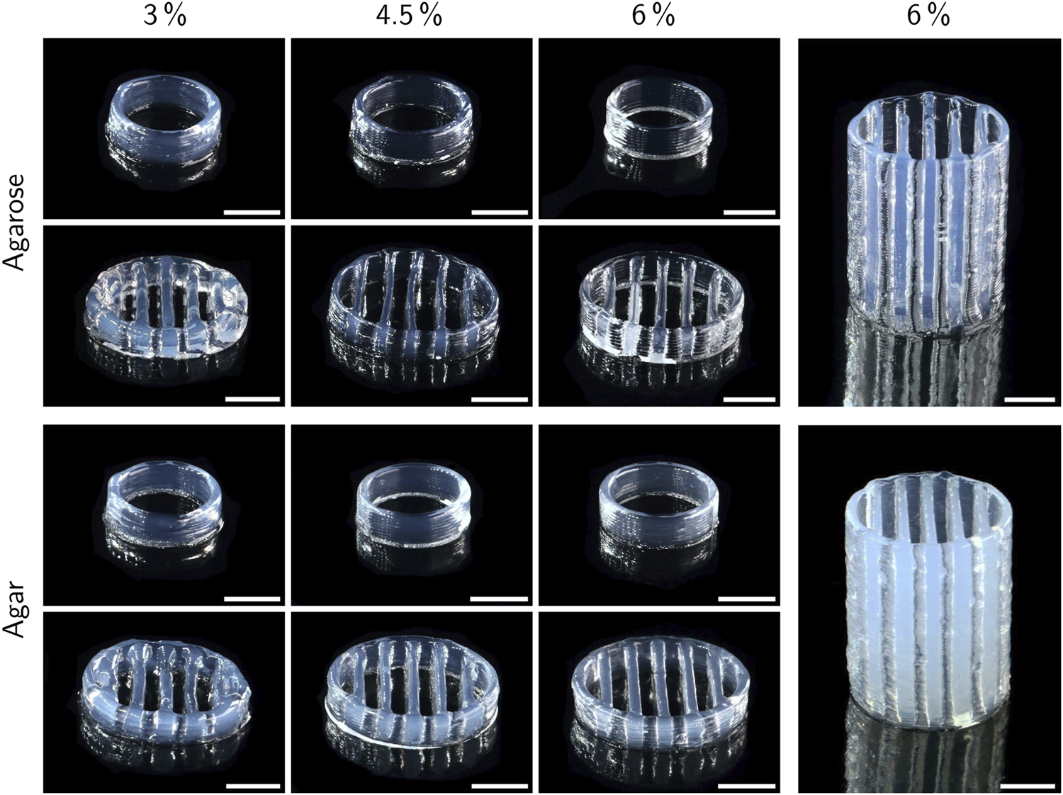 Exemplary prints of low-melt agarose and agar hydrogels with a target height of 3 mm (left side) and 20 mm (right side). All prints were carried out at a layer height of 300 µm. Scale bars represent 5 mm.