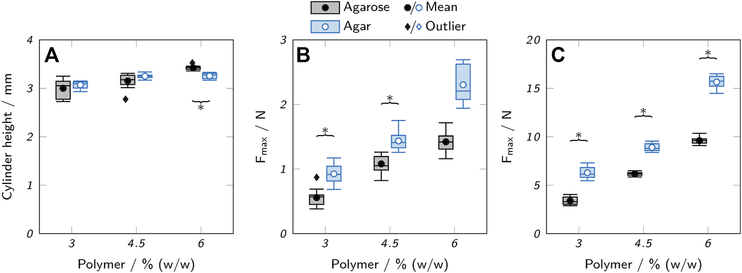Mechanical testing of low-melt agarose and agar hydrogels. (A) Height of printed hydrogel cylinders. (B,C) Maximum applicable compression force Fmax before rupture of (B) printed hollow hydrogel cylinders and (C) cast hydrogel samples. The box plots represent the median and the upper and lower quartile. The whiskers represent the most extreme value still within a 1.5-fold interquartile range (IQR) from the upper and lower quartile. All data points outside the 1.5-fold IQR are depicted as outliers. Each box represents twelve samples (n = 12). Significant differences between agarose and agar are highlighted by asterisks (p < 0.05).