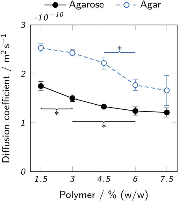 Diffusion coefficients of 5(6)-carboxyfluorescein in low-melt agarose and agar hydrogels. The data points represent mean values ± standard deviation (n = 3). For clarity, only significant differences to the nearest significantly different data points are highlighted by asterisks (p < 0.05).