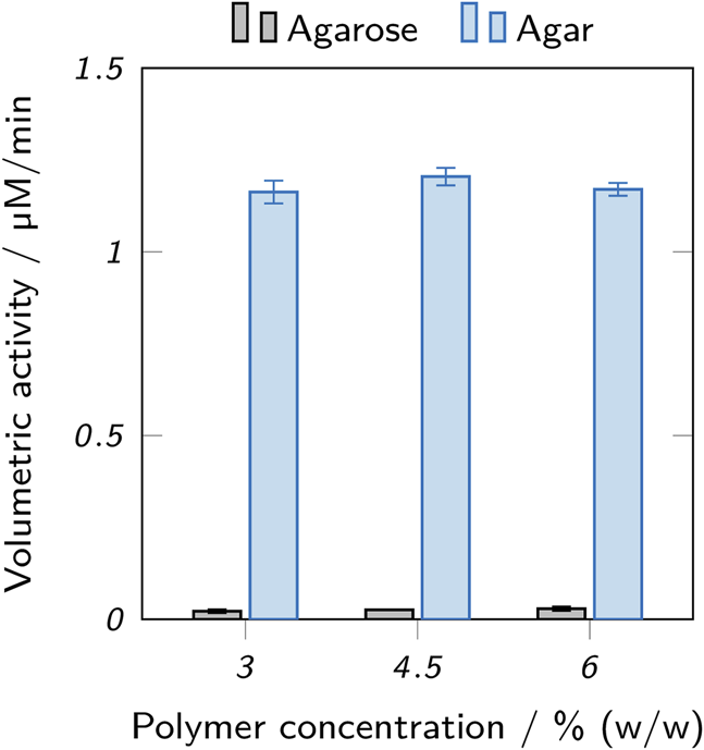 Enzyme-laden hydrogel cylinders were immersed in buffer for 120 min and samples of the supernatants were analyzed for leached enzyme using activity assays. Figure 9 shows the acquired results. Only a low amount of enzymatic activity was observed in the supernatants of agarose hydrogels (below 0.03 μM/min), but values between 1.16 μM/min and 1.20 μM/min were determined for the supernatants of agar hydrogels. For both hydrogel types, no significant differences between different polymer concentrations were found. The substantial enzyme leaching observed for agar hydrogels indicates that no sufficient enzyme retention was achieved. In perfusable reactors, the degree of leaching would be even higher than in the static experiment performed here. This demonstrates the poor suitability of agar hydrogels in this context.