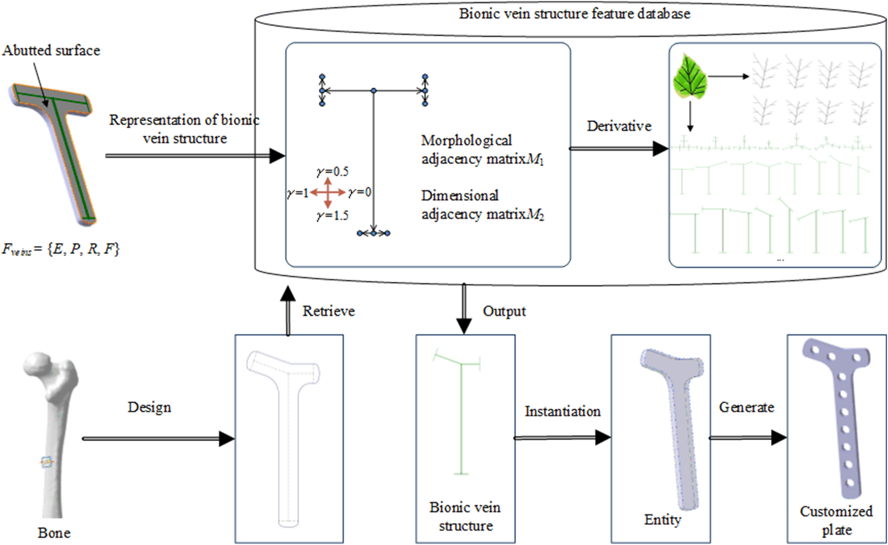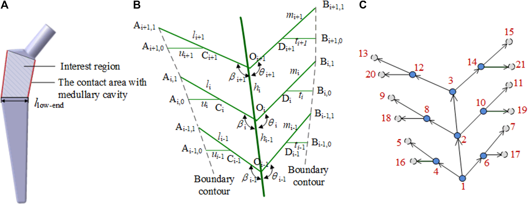 Parametric methods are usually used to achieve rapid implant design. Although semantic parameters facilitate the size modification of implants, they alone cannot rapidly retrieve implant information. Therefore, in the implant feature representation, the implant abutted surface is first represented by the bionic vein structure (the details are discussed in Section 2.2), and the vein structure contains the vein feature points and curves. Next, high-level semantic parameters are set based on the bionic vein structure. Hence, the representation of implant features facilitates the retrieval and design of the implant.