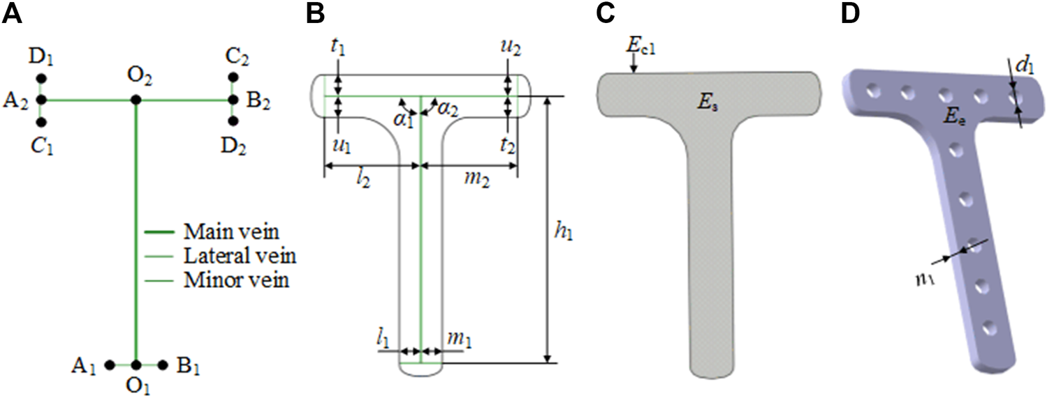 Characteristic representation of the T-shaped bone plate based on the bionic vein structure. (A) Vein structure of T-shaped bone plate, contains main vein, lateral vein, minor vein, and vein feature points. The vein feature points include the main vein feature points (O1, O2), the lateral vein feature points (A1, B1, A2, B2), and the minor vein feature points (C1, D1, C2, D2). (B) Semantic parameters of T-shaped bone plate, mainly refers to the length of veins and the angle between veins. (C) Abutted surface of T-shaped bone plate constructed by filling on the basis of panel (A, B). (D) Entity of T-shaped bone plate generated by stretching on the basis of panel (C).
