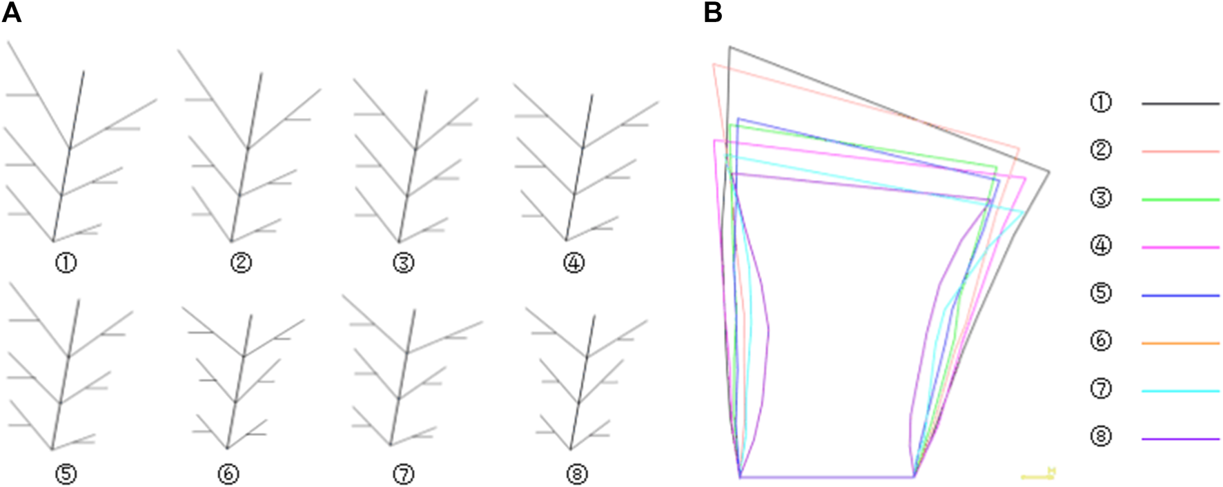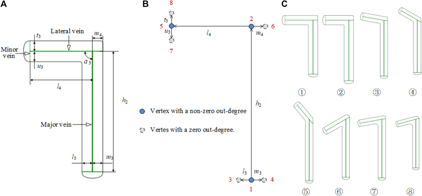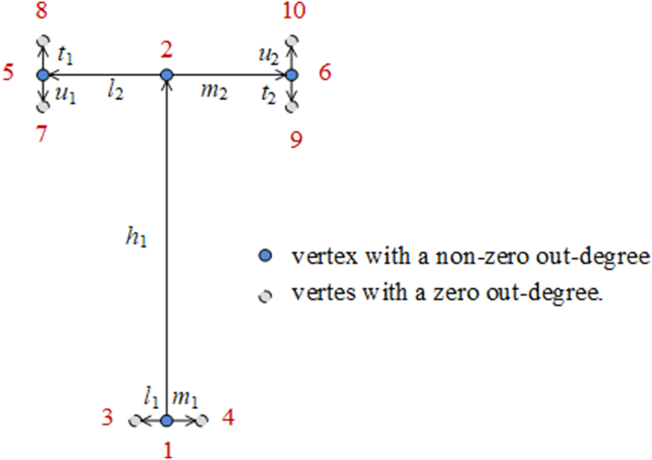 We stipulate the grades of the leaf veins, from high to low, as main vein, lateral vein, and minor vein. We also stipulate that the growth direction of the leaf veins is from high to low. Vertices are numbered from the bottom to the top and from left to right. A directed edge connected to an ordered pair of vertices is represented as <