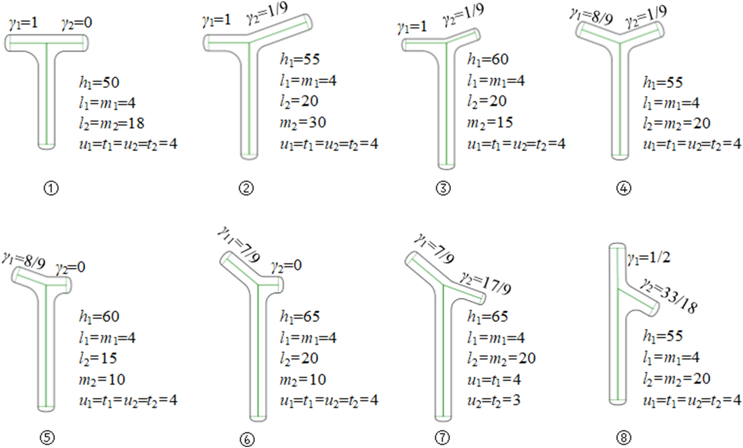 n) F1 = {90°<α1 < 180°, 90°<α2 < 180°, u1 = t1, u2 = t2, l1 = m1, l1<l2<h1, d1 < 2t1 }.