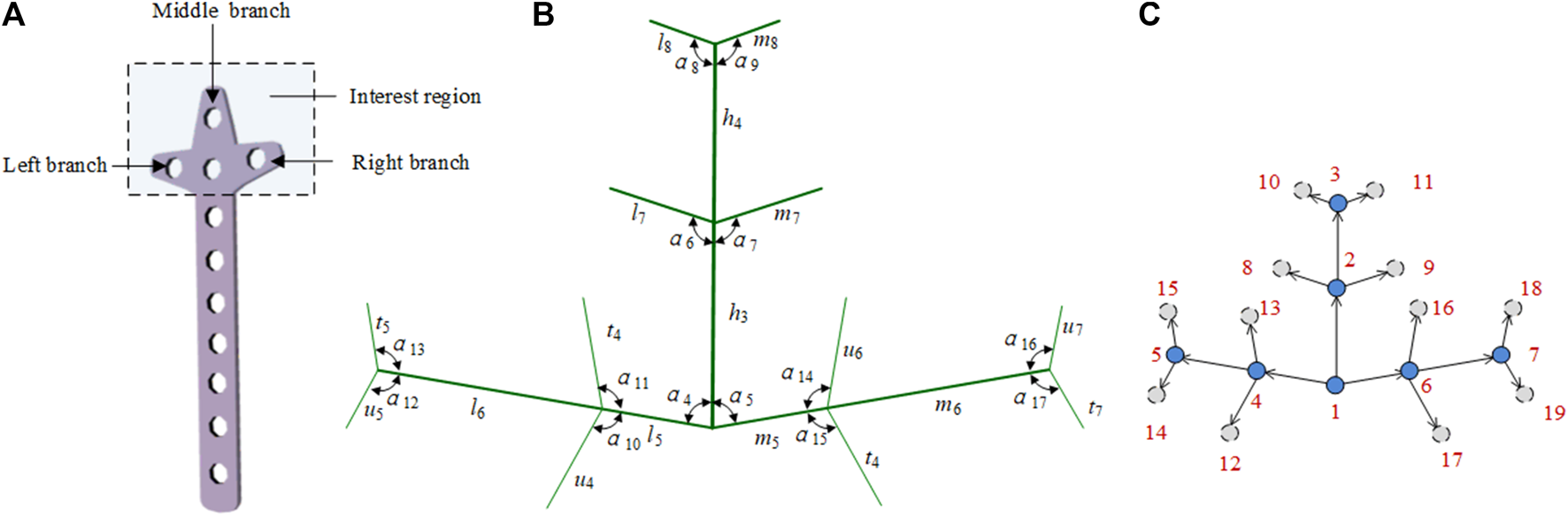 i) P2 = {u1, t1, u2, t2}, where u1 and t1 represent the length of the left and right minor veins, respectively, of the left branch of the bone plate head, and u2 and t2 represent the length of the left and right minor veins, respectively, of the right branch of the bone plate head.