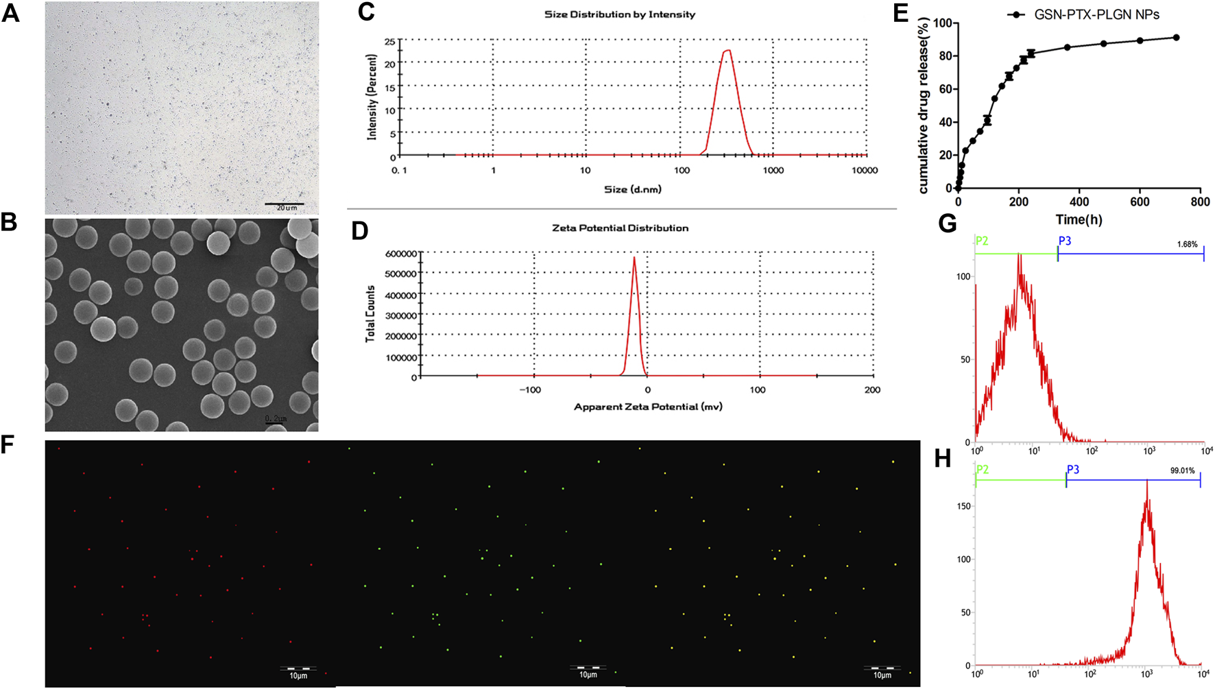 (A) Light microscope image of GSN-PTX-PLGA NPs (× 600). (B) Scanning electron microscopy image of GSN-PTX-PLGA NPs (× 30,000). (C) The size distribution of GSN-PTX-PLGA NPs detected by a laser particle size analyzer. (D) The zeta potential of GSN-PTX-PLGA NPs detected by a laser particle size analyzer. (E)In vitro release curve of GSN-PTX-PLGA NPs. (F) Red fluorescent dots were observed after binding with DiI-labeled PLGA NPs. Green fluorescent dots were observed after binding DiI-labeled PTX-PLGA-GSN NPs and the secondary antibody. (G) The connection rate of the bound antibody on the surface of PLGA NPs detected by the flow cytometry technique was 1.68%. (H) The connection rate of the bound antibody on the surface of GSN-PTX-PLGA NPs detected by the flow cytometry technique was as high as 99.01%.