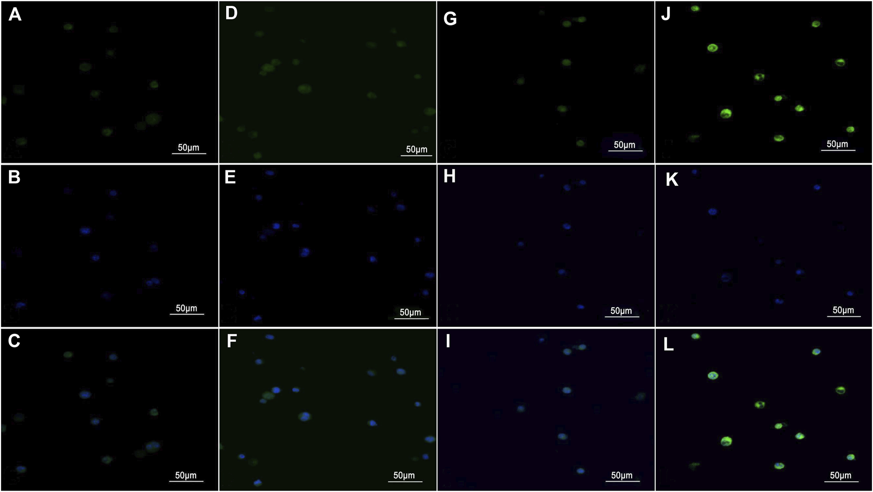 Images were acquired using a laser confocal scanning microscope (×400). (A,D,G, and J) Green fluorescence was observed in the cytoplasm of cells after the uptake of the contrast medium. (B,E,H, and K) Blue fluorescence was observed in DAPI-stained nuclei. (C,F,I, and L) The cytoplasm and the nucleus were merged. (A–C) Hca-F cells with PLGA NPs. (D–F) Hca-F cells with antibody blocking. (G–I) Hca-P cells with GSN-PLGA NPs. (J–L) Hca-F cells with GSN-PLGA NPs.