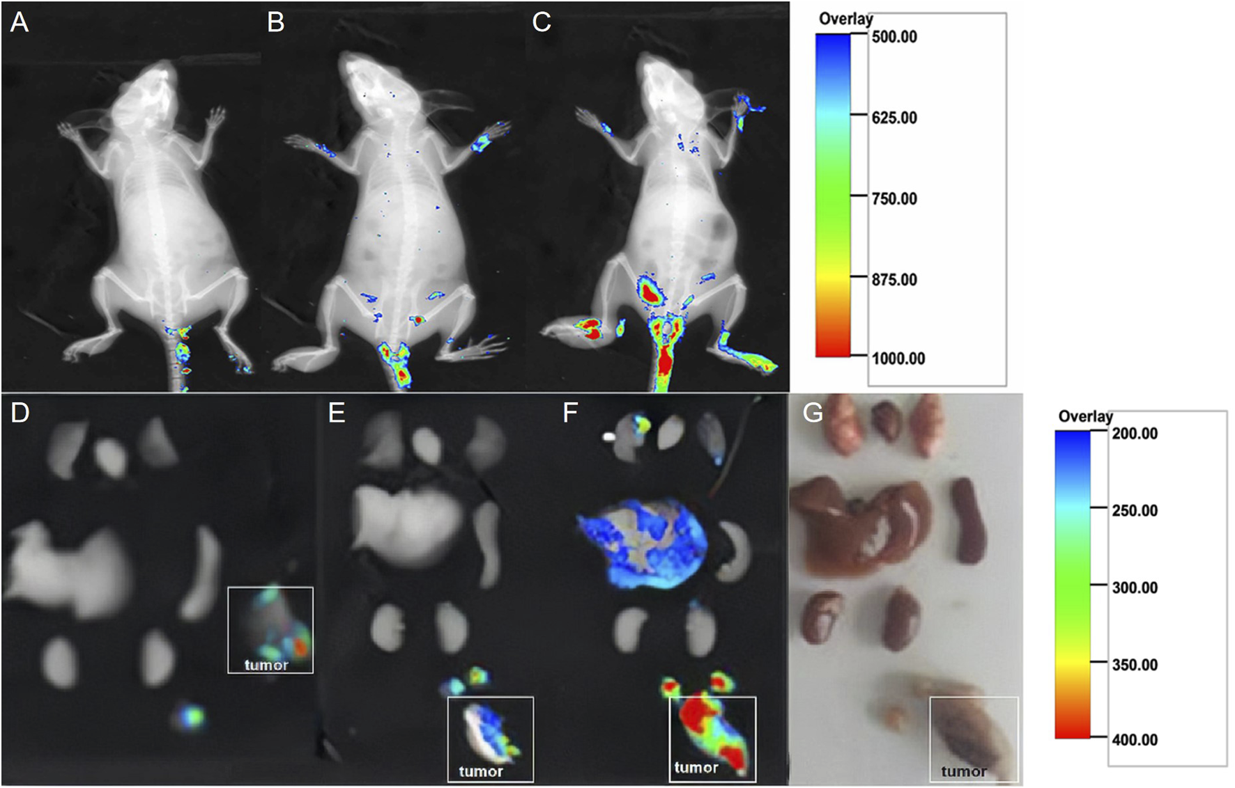 Fluorescence images of living tumor-bearing mice injected with the same dose of fluorescent NPs. (A) Control group 1: 0.2 ml of DiI-labeled NS was injected. (B) Control group 2: 0.2 ml of DiI-labeled PLGA NPs was injected. (C) Experimental group: 0.2 ml of DiI-labeled GSN-PLGA NPs was injected. Fluorescence in the isolated organs, including the lungs, heart, liver, spleen, and kidneys, as well as implanted tumor tissues and ipsilateral enlarged lymph nodes of the mice in order from top to bottom. (D) Control group 1: 0.2 ml of DiI-labeled NPs was injected. (E) Control group 2: 0.2 ml of DiI-labeled PLGA NPs was injected. (F) Experimental group: 0.2 ml of DiI-labeled GSN-PLGA NPs was injected. (G) Isolated organs.