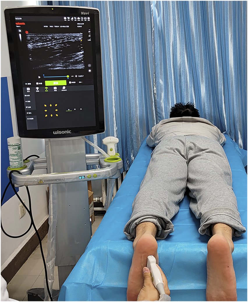 A Wisonic ultrasonic scanner (Navis, Wisonic) was used in B mode to measure the plantar fascia angle. The linear transducer frequency was 10–2 MHz. During measurement, each subject lay prone on the examination bed, with the lower limbs straight and the feet hanging over the edge of the examination bed in a neutral position (Haen et al., 2017) (Figure 1). The upper body and legs were relaxed.