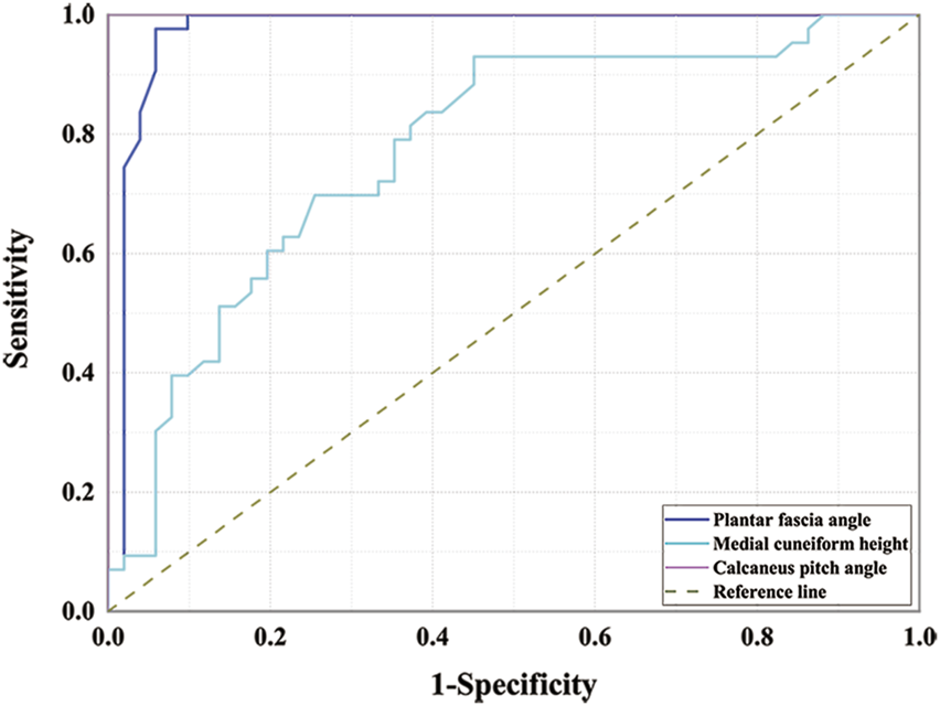 In addition, the area under the ROC curve was used to test the diagnostic efficiency. The AUCs for the medial cuneiform height and plantar fascia angle are 0.775 and 0.973, respectively. Both of these measures have good diagnostic effect. The AUC for the plantar fascia angle is more significant than that for the medial cuneiform height (Z = 2.55, p = 0.0108); this suggests that the plantar fascia angle has better diagnostic efficiency in the diagnosis of flatfoot. The AUC for the plantar fascia angle is not more statistically significant than that for the calcaneal pitch angle (Z = 1.42, p = 0.1556); this suggests that the plantar fascia angle has the same diagnostic efficiency as calcaneal pitch angle in the diagnosis of flatfoot.