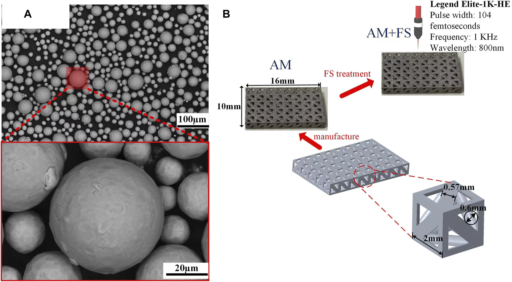 Materials and samples: (A) SEM image of the titanium alloy powder; (B) bone scaffold sample.