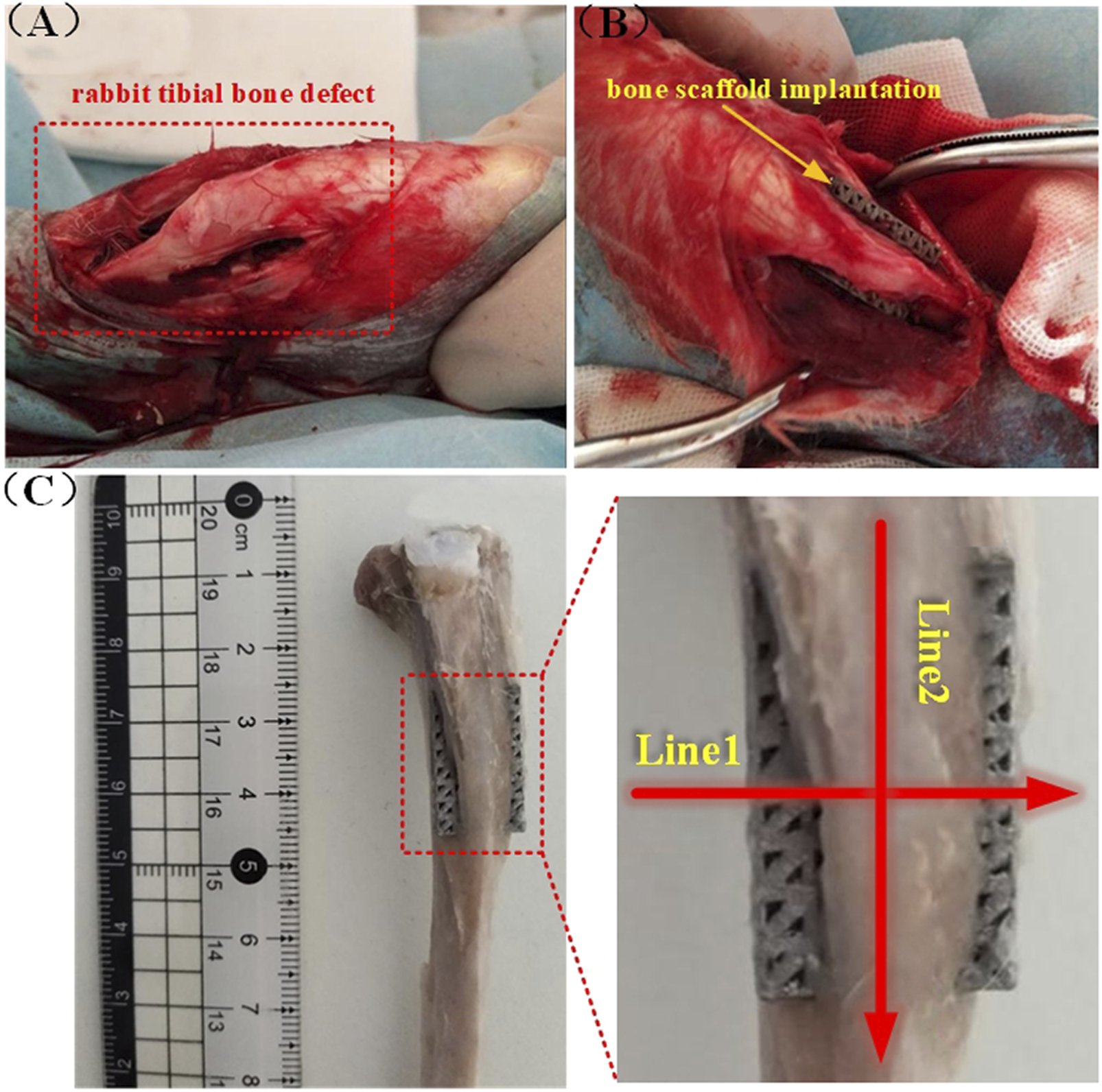 Rabbit tibial implantation experiment: (A) Rabbit tibial defect; (B) bone scaffold implantation; (C) schematic diagram of the cutting line of the hard tissue section after removal of the implanted bone scaffold.