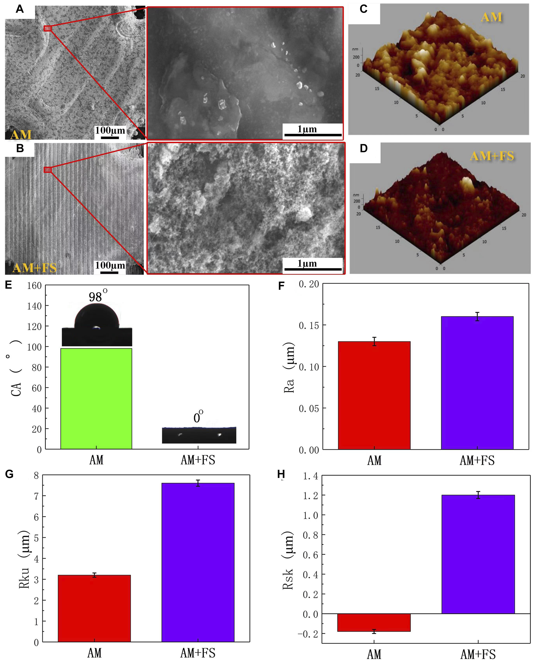 Surface characteristics: (A–B) SEM images and optical microscopic images of the surface of AM and AM + FS samples; (C–D) AFM three-dimensional morphologies of the AM and AM + FS samples; (E) the water contact angles of the sample surface; (F–H) surface parameters of Ra, Rku, and Rsk of samples.