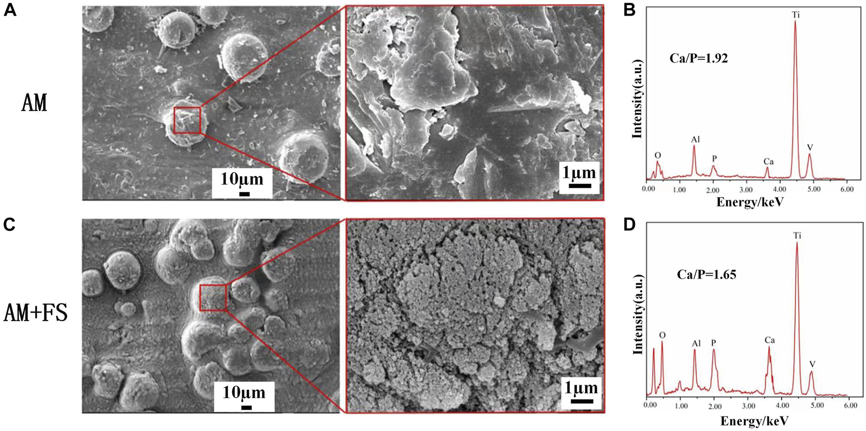 SEM and EDS of the surface of samples soaked in SBF for 14 days: (A–B) AM samples; (C–D) AM + FS samples.