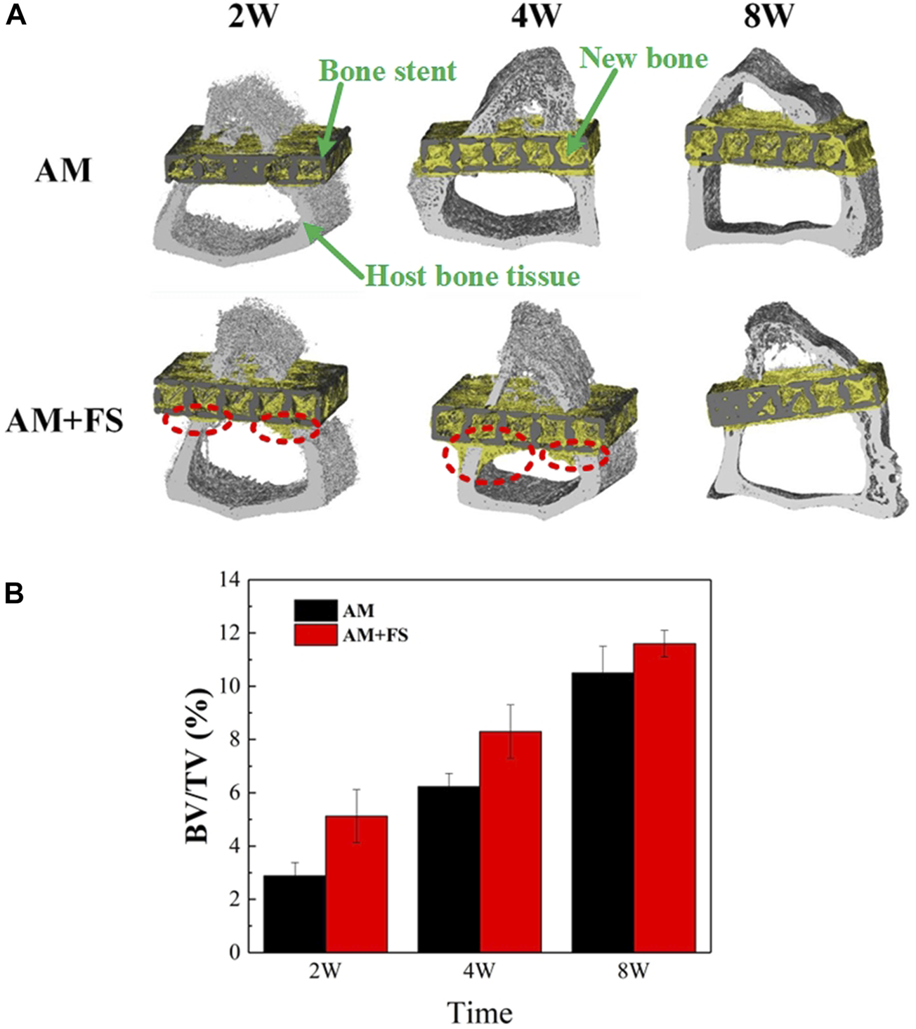 As can be seen from the three-dimensional reconstruction model (Figure 5A), with the increase in implantation time, there was an increasing number of new bone tissues in the scaffold. In the first 2 weeks of implantation, it might be seen that the cortical bone tissue of the AM + FS samples extended to the marrow cavity along the contour of the scaffold, which was not the case in the AM samples. At the fourth week after implantation, the new bone tissue of cortical bone cells in the AM + FS samples increased gradually along the contour of the scaffold. In contrast, the bone tissue in the AM samples did not grow to the bone marrow cavity along the contour of the scaffold, which showed that the surface of the bone scaffold had better biocompatibility and osteoconduction after the femtosecond laser surface treatment. At the eighth week of implantation, it might be seen that many new bone tissues were growing in the AM samples and AM + FS samples. Nevertheless, compared with the AM samples, there were more new bone tissues in the pores of AM + FS samples. Bone tissue and scaffolds have become a whole, forming good osteointegration.