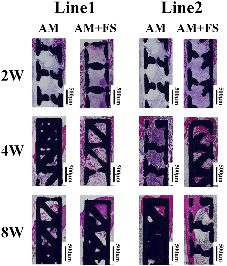For the Line1 direction, the bone tissue first grew from the place where the cortical bone contacted the scaffold to both sides (Figure 6). In the second week, the bone tissue cells of the AM + FS samples proliferated bilaterally. However, only a few cells proliferated bilaterally in the AM samples. In the fourth week, the bone tissue cells of the AM + FS samples proliferated bilaterally and expanded into the inner pores of the scaffold. In the AM samples, bone tissue cell growth remained mostly unaltered. There were considerably less bone tissue cells in the inner pores of the AM samples than the AM + FS samples. In the eighth week, bone tissue could be found to be present in the inner pores of the AM samples and the AM + FS samples in contact with the cortical bone. The AM + FS samples had a wider contact area with bone tissue than the AM samples did, and the bone tissue interlocked well with the scaffold.