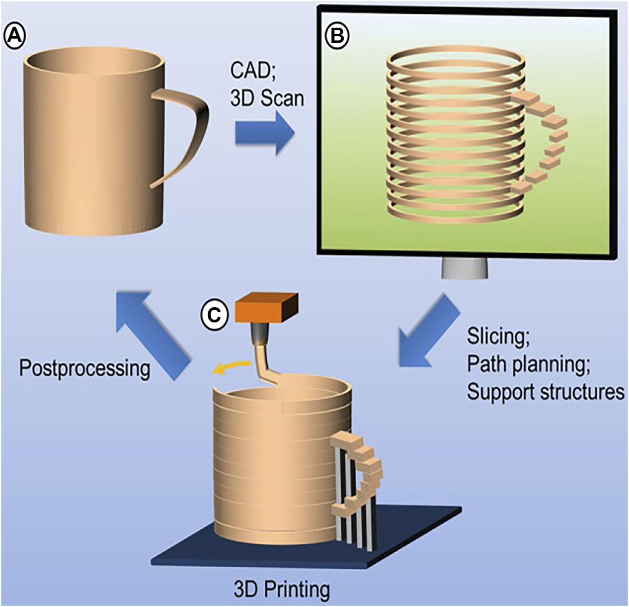 Basic principles of additive manufacturing. (A) Data acquisition; (B) data processing; (C) printing (source: Ligon et al. 2017)
