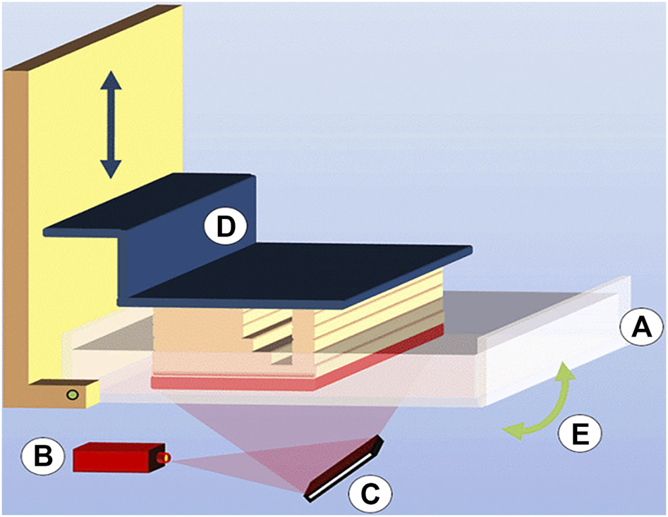 Digital light processing (DLP) consisting of (A) a vat filled with photopolymer resin, (B) light source, (C) micromirror array, (D) vertically movable building platform, and (E) tilting device to replenish the uncured bottom layer (source: Ligon et al. 2017).