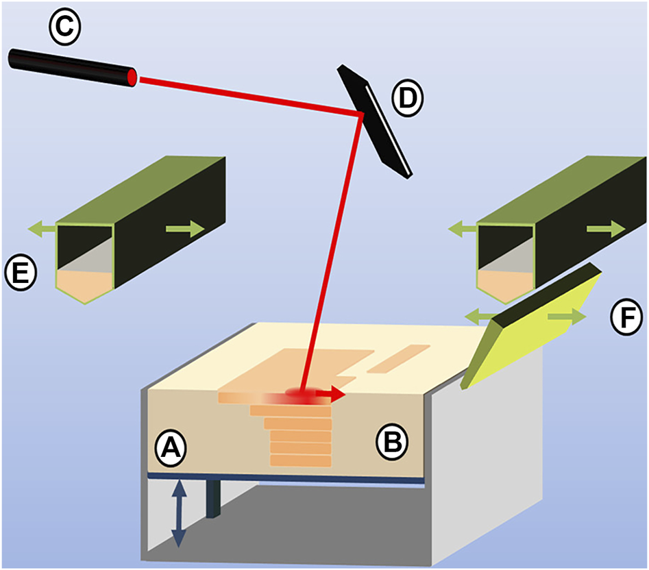 Selective laser sintering process composed of (A) vertically movable build platform, (B) powder bed with embedded, sintered model layers, (C) laser source and (D) laser optics, (E) powder feedstock and deposition hopper, and (F) blade for powder distribution and leveling (source: Ligon et al. 2017).