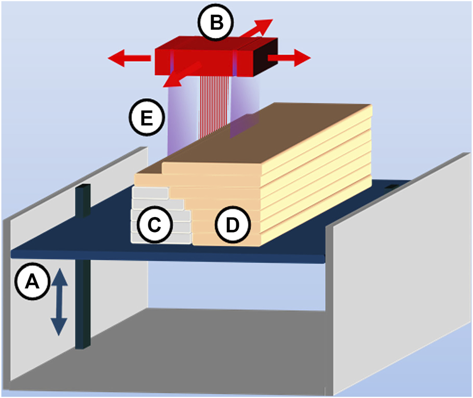 PolyJet process consisting of (A) vertically movable building platform, (B) multinozzle inkjet head, (C) layers of support material, (D) layers of building material, and (E) UV source attached to an inkjet head (source: Ligon et al. 2017).