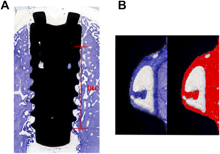 The specimens were sequentially dehydrated using 80%, 85%, 90%, 95%, and 100% ethanol and embedded in epoxy resin for 24 h (Rong et al., 2018). Dehydrated specimens were sliced in the buccolingual direction with a thickness of 100 μm using an E300CP diamond saw microtome (EXAKT, Germany). Hard-tissue sections were ground with the EXAKT 400 CS microchip grinder (about 50 μm thickness) and polished to a thickness of 30 um. After washing, the hard-tissue sections were stained with the toluidine blue solution according to the manufacturer’s instructions (Rong et al., 2018). The images were collected by CaseViewer (Panoramic MIDI; 3D HISTECH; Hungary). Analysis of the histological section was performed using ImageJ software. According to the description by Javier Sanz-Esporrin et al. before with minor changes, the percentage of histological BIC was calculated along a selected surface on the buccal and lingual aspects (Sanz-Esporrin et al., 2021). Histological analysis was used to determine the bone-to-implant contact percentage as BIC% = length of implant surface line with bone contact/total length of implant surface line (from first wound chambers to the last) (Figure 1A). Three wound chambers (on the middle of the implant) on each buccal and lingual aspect were selected to calculate the percentage of bone tissue (including newly formed bone and parent bone) considering the total wound chamber area as 100% (Figure 1B). Again, the investigator was blinded to the specific group division.