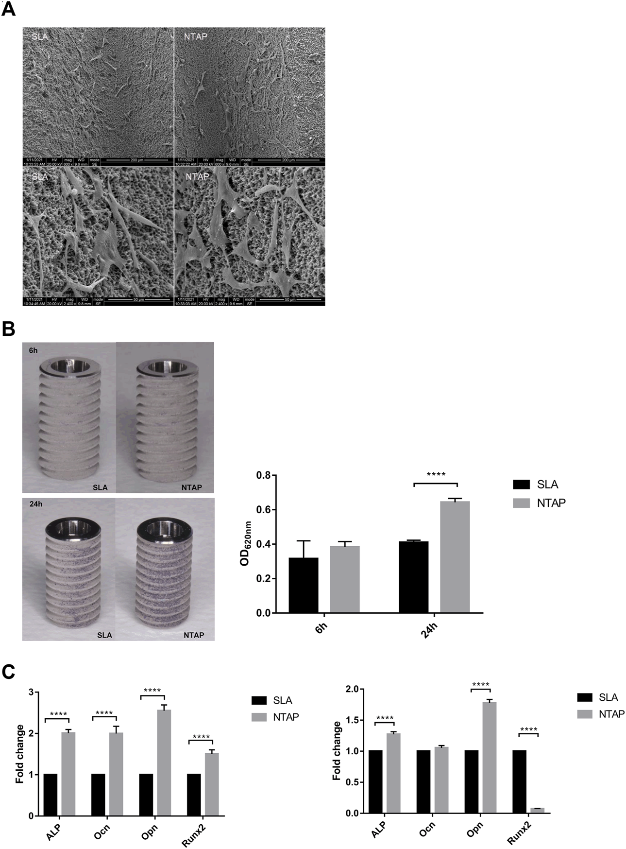 Biological behavior of MC3T3-E1 cells on NTAP and SLA implants. (A) Cell morphology at 12 h observed by SEM (magnification: ×600 and ×2400). (B) Cell adhesion at 6 h and 24 h measured by crystal violet staining. (C) Expression of osteogenic differentiation-related genes (alp, ocn, opn, and runx2) of MC3T3-E1 cells at 7 days (left) and 14 days (right) tested by RT-qPCR. Values represent the means of data obtained from three different experiments with standard deviations. **** = p < 0.001 of Student’s t test using IBM SPSS 26 (the error bars indicate standard deviations).