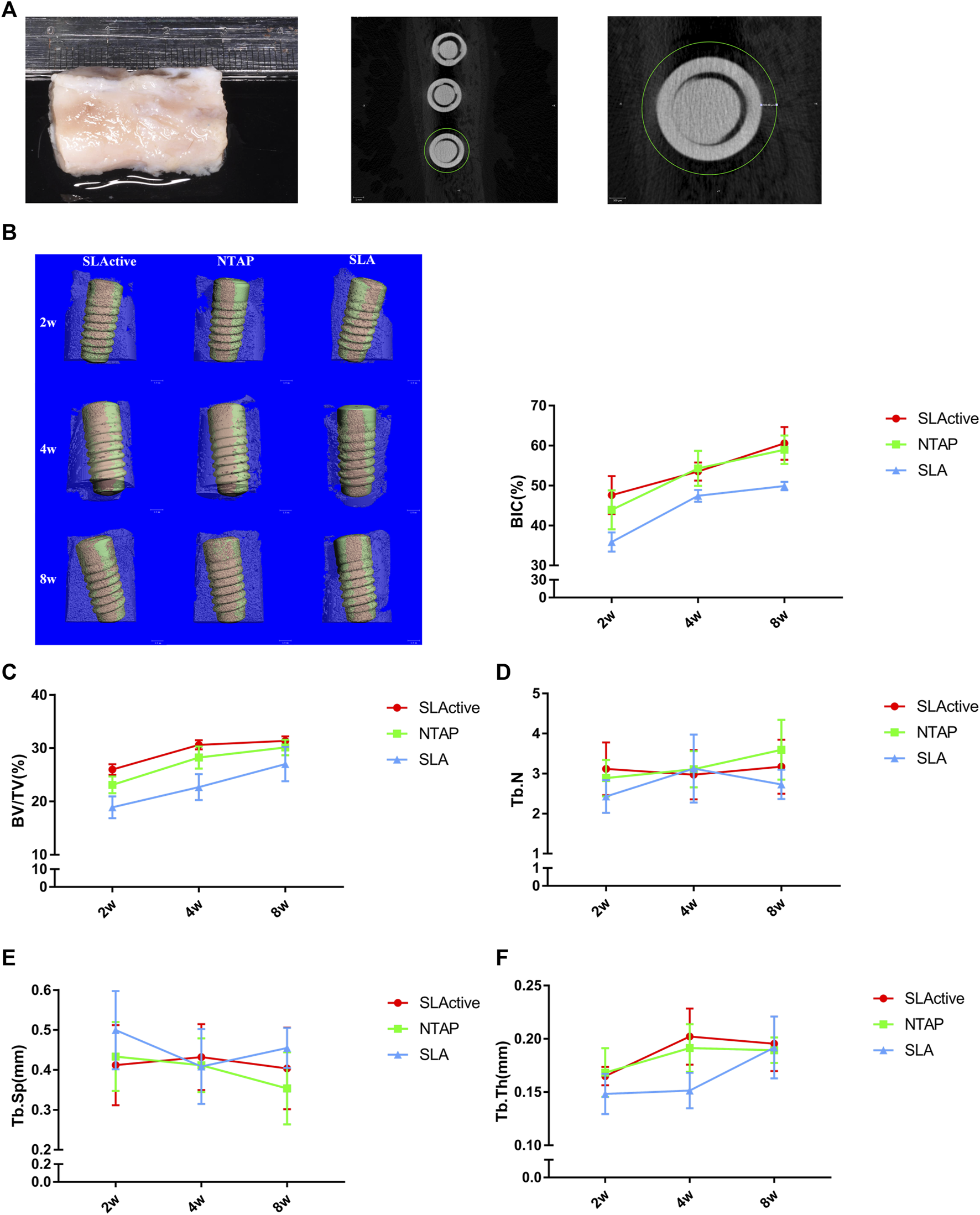 Micro-CT analysis of SLActive, NTAP, and SLA implants with the surrounding bone tissue (n = 4). (A) Mandible specimens with implants and transverse micro-CT view (left), and a region of interest (ROI) was defined as the circumferential region exactly 500 μm away from the implant surface. (B) BIC% of the implant at 2 w, 4 w, and 8 w (left: 3D reconstruction; orange represents the direct contact between the bone and implants). (C) Bone volume fraction (BV/TV). (D) Trabecular thickness (Tb.N). (E) Trabecular separation (Tb.Sp). (F) Trabecular thickness (Tb.Th). Values represent the means of data obtained from three different experiments with standard deviations. * = p < 0.05 of the Kruskal–Wallis test with the Bonferroni correction using IBM SPSS 26 (the error bars indicate standard deviations).