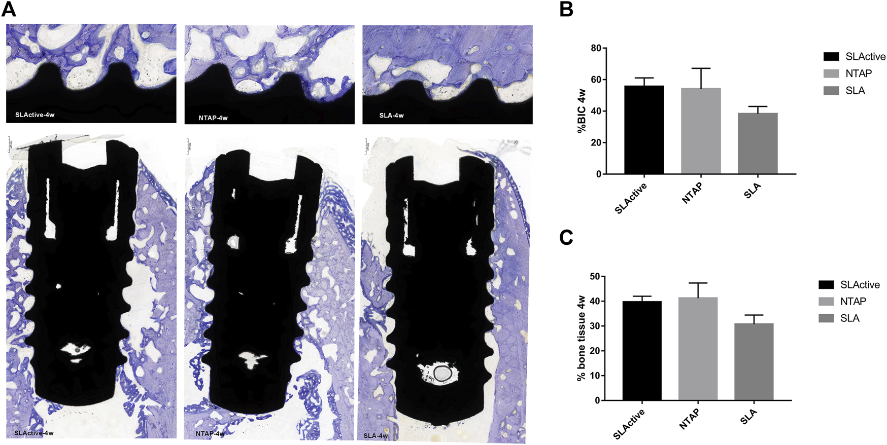 Histological section and analysis after 2 weeks of implantation (n = 3). (A) New bone formation was assessed by toluidine blue staining in the SLActive, NTAP, and SLA groups. Magnification: upper ×10 and lower ×2 and scalebar = 500 μm. (B) Percentage of histological BIC. (C) Percentage of bone tissue in wound chamber. Values represent the means of data obtained from three different experiments with standard deviations. * = p < 0.05 of the Friedman test using IBM SPSS 26 (the error bars indicate standard deviations).