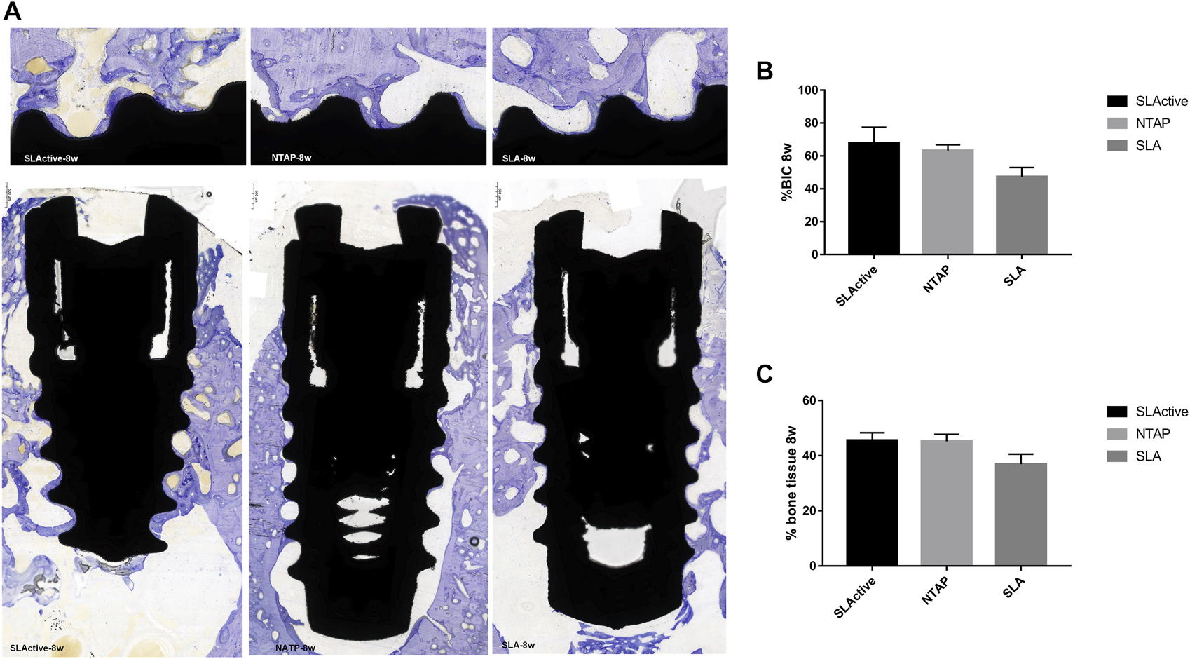 Material and methods: The NTAP effectiveness was examined using in vitro cell experiments. Then, six beagle dogs were included in the in vivo experiment. Straumann SLActive implants, SLA implants, and SLA implants treated with NTAP were implanted in the mandibular premolar area of dogs. After 2 w, 4 w, and 8 w, the animals were sacrificed and specimens were collected. Radiographic and histological analyses were used to measure osseointegration.