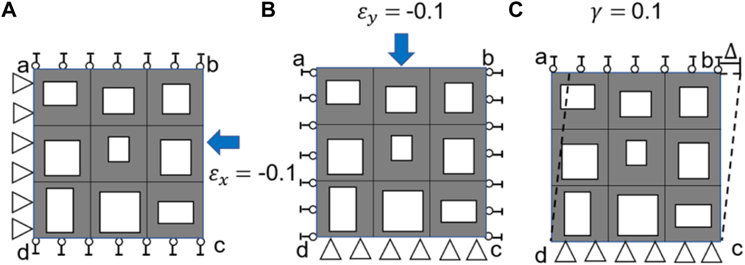 FIGURE 3. Three loading scenarios used for calculating the elasticity matrix of bone scaffold, (A) uniaxial loading in the x direction, (B) uniaxial loading in the y direction and (C) shear loading in the x-y plane.