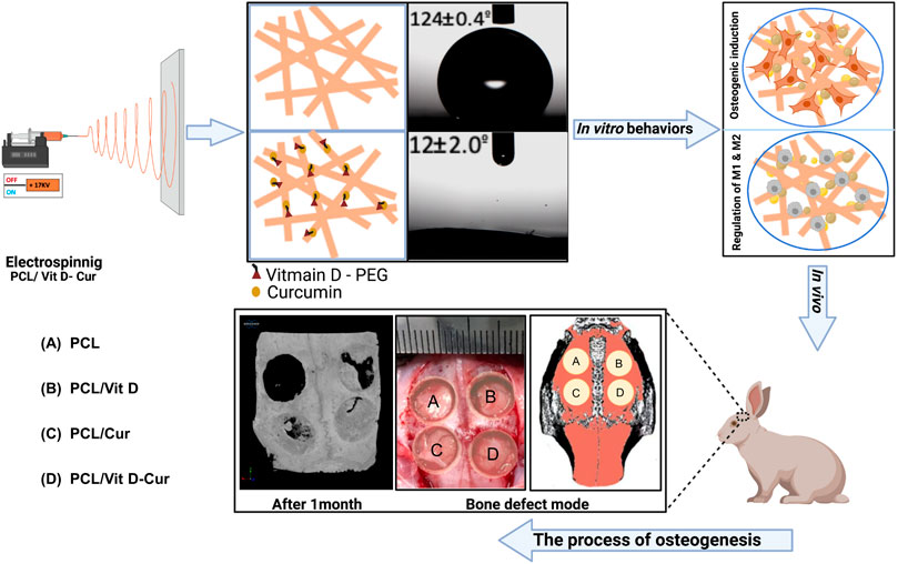 Figure 1. Graph of scaffold fabrication and use for enhancing the anti-inflammatory and bone formation in vitro and in vivo: (A) PCL, (B) PCL/Vit D, (C) PCL/Cur, and (D) PCL/Vit D-Cur.