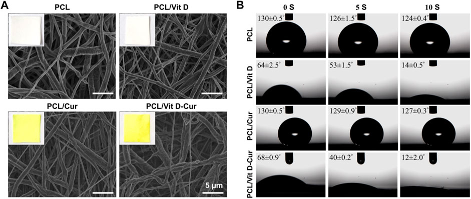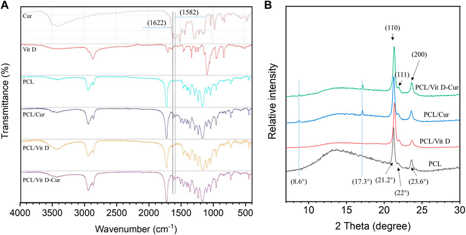 SEM examinations were conducted to investigate the fiber morphology. As shown in Figure 2A, there was no significant change in the morphology of fibers produced from PCL, PCL/Vit D, PCL/Cur and PCL/Vit D-Cur scaffolds. All scaffolds were properly linked fibers. The PCL and PCL/Cur electrospinning nanofiber scaffolds were hydrophobic (Figure 2B). Within 10 s, the contact angle of PCL was 124.4°, and of PCL/Cur was 127.3°. In addition, Vit D was considered hydrophobic, but PEG modification significantly enhanced its hydrophilicity, resulting in a water contact angle of 14.1° for PCL/Vit D membrane at 10 s. Additionally, when Vit D and Cur were co-doped with PCL fibers, the corresponding PCL/Vit D-Cur samples also showed good hydrophilicity (about 12.2°), which is very important for bone repair materials. The FTIR data of Figure 3A were measured using KBr pellet method, and the spectra of Cur are downloaded from the Chemistry Database (Shanghai Institute of Organic Chemistry of CAS., http://www.organchem.csdb.cn). As shown in Figure 3A, the PCL, PCL/Vit D, PCL/Cur, and PCL/Vit D-Cur scaffolds exhibit similar adsorption features. The peak at 2,940 and 2,860 cm−1 is assigned to the asymmetric and symmetric stretching vibration of CH2, and the peaks at 1723 cm−1 are assigned to the C=O stretching vibration. The peaks at 1,622 and 1,583 cm−1 can be attributed to the C=C stretching vibration of the aromatic ring, indicating the successful loading of Cur into the PCL scaffold. However, since the chemical structure of PEG-Vit D is consistent with that of PCL, their FTIR spectra are almost identical. XRD was used to detect the crystalline structures of various scaffolds. As shown in Figure 3B, there is no obvious trend in the overall crystallinity of PCL nanofibers loaded with Vit-D and Cur molecules. However, compared to PCL, the decrease of the peak at 12–17° and the increase of the (110) peak (2θ = 21.2°) and (110) peak (2θ = 22°) of PCL/Vit-D, PCL/Cur and PCL/Vit D-Cur scaffold suggested an increase in crystalline perfection. This indicated that Cur and Vit D were successfully incorporated into the PCL scaffold and had a weak effect on the crystallization of the PCL scaffold. In addition, the characteristic peak appeared at around 8.6 and 17.3°, confirming the presence of Cur in the PCL/Cur and PCL/Vit D-Cur groups (Ching et al., 2019).