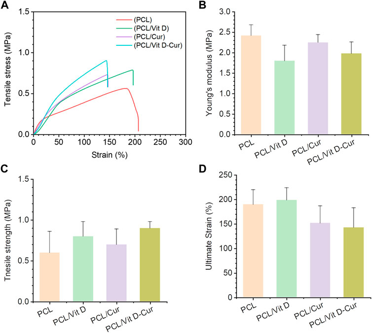 Figure 4. Mechanical characterization of PCL, PCL/Vit D, PCL/Cur, PCL/Vit D-Cur scaffolds (A) representative stress-strain curves of scaffolds recorded from a tensile test; (B) Young’s modulus, (C) tensile strength, and (D) ultimate strain calculated from the stress-strain curves. Error bars represent mean ± SD for n = 3.
