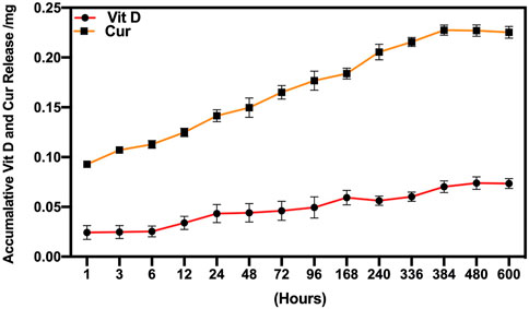 According to previous studies (Alexis et al., 2004; Zhu et al., 2015), a mixture of water and ethanol (80:20) was used as a release medium because Vit D is a fat-soluble vitamin and Cur was slightly soluble in water. Briefly, 50 mg thetheelectrospunn membrane that loaded Vit D and Cur was immersed in 10 ml release medium and then transferred to a shaking incubator (150 rpm) at 37°C. At regular intervals, 1 ml of the release medium was collected and added with the same volume of fresh medium. Afterward, the sample liquids were measured by using a Nanodrop (Thermo Scientific™, Nanodrop 2000 and 2000c, United States) at wavelengths of 240 nm (Vit D) and 427 nm (Cur). A calibration curve was used to determine the accumulative drug release amount, and the data was displayed in a graphical form.