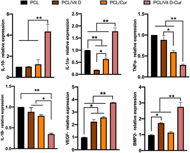 Figure 7 shows the expression of some inflammatory genes, including anti-inflammatory genes IL-10/IL-1ra and pro-inflammatory gene TNF-α/IL-1β. The expression of four genes in the PCL/Vit D-Cur group and other groups was significantly different. PCL/Vit D-Cur substrates significantly increased IL-10 and IL-1ra expression while decreased IL-1β and TNF-α expression. Besides, macrophages cultured on PCL/Vit D-Cur enhanced the expression of angiogenic and osteogenic genes (VEGF and BMP-2), as shown in Figure 7.