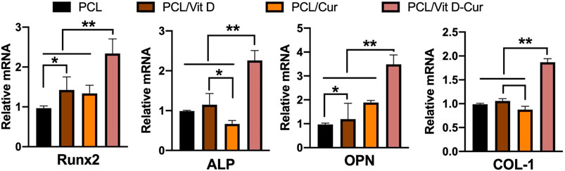 In this study, the conditioned medium of RAW264.7 cells seeded on different membranes was collected and used to activate MC3T3-E1 cells. As expected, PCL/Vit D-Cur exhibited the greatest effect on cell viability, ALP activity, and mineralization level (Figure 8). There was a significant difference between PCL/Vit D-Cur and the other three groups. Moreover, the mRNA levels of Runx2, ALP, OPN, and COL-І in the PCL/Vit D-Cur group were significantly higher than those in the other groups after culturing for 7 d in the conditioned medium (Figure 9).