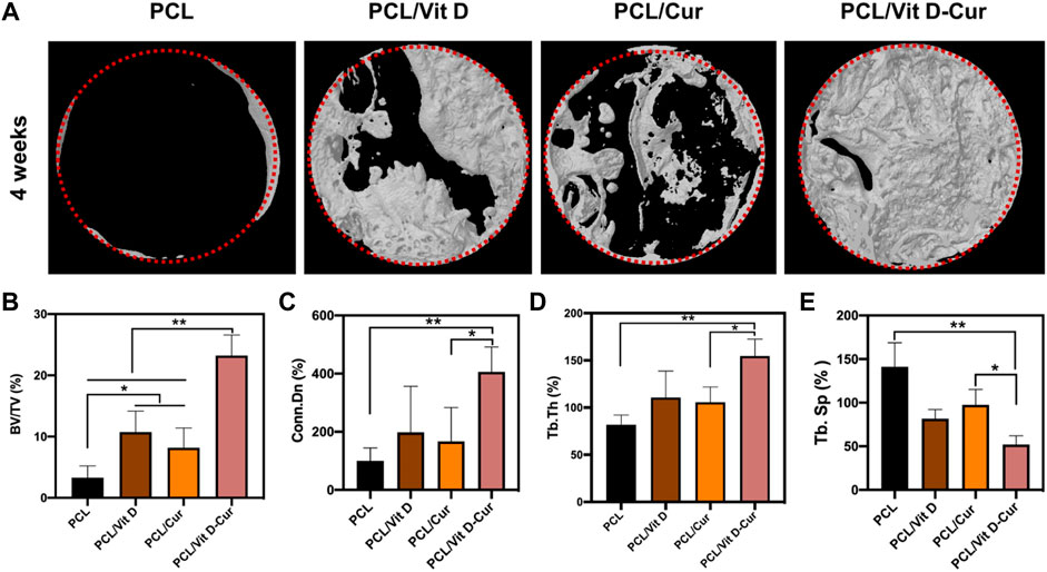The micro-CT orthography was used to portray the three-dimensional network of the newly formed bones. The findings revealed that dual Vit D and Cur releases improved bone formation after 4 weeks of operation. The scaffold loaded with Vit D and Cur demonstrated the most compatible osseointegration within 4 weeks compared to PCL, PCL/Vit D, and PCL/Cur scaffolds. The bone in the defect area of the PCL/Vit D-Cur scaffold shows a significantly higher ratio of bone tissue formation, as shown in Figure 10A. Furthermore, as shown in Figures 10B–D, the BV/TV, Conn. D and Tb. The PCL/Vit D-Cur group was significantly higher than the other groups (p < 0.05 or/and <0.01). Additionally, the Tb. Sp around the PCL/Vit D-Cur scaffolds was significantly less than other scaffolds, as shown in Figure 10E.