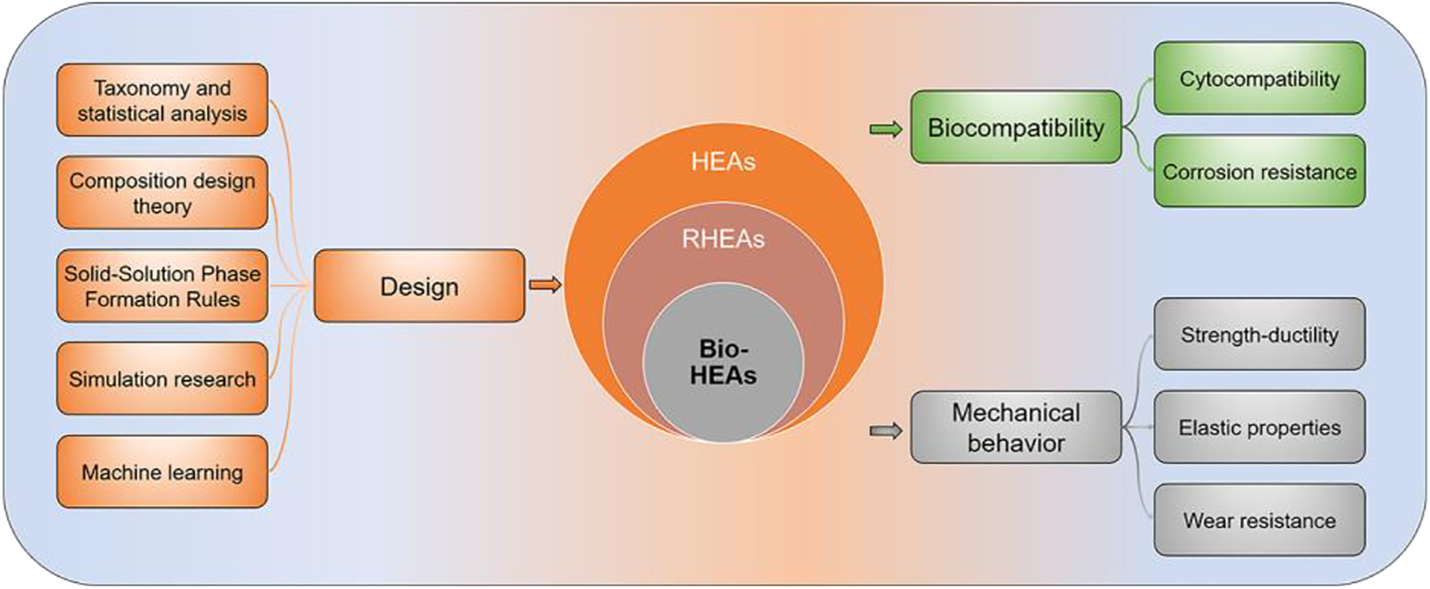 A mind map to explore the design theory, biocompatibility, and mechanical properties of Bio-HEAs in this paper.